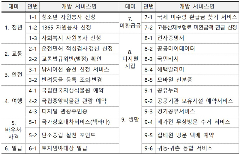 행안부는 지난해 기업·국민 선호도 조사, 아이디어 공모전 결과 등을 토대로 행정·공공기관 수요조사를 거쳐 개방 서비스 후보군을 추렸다.