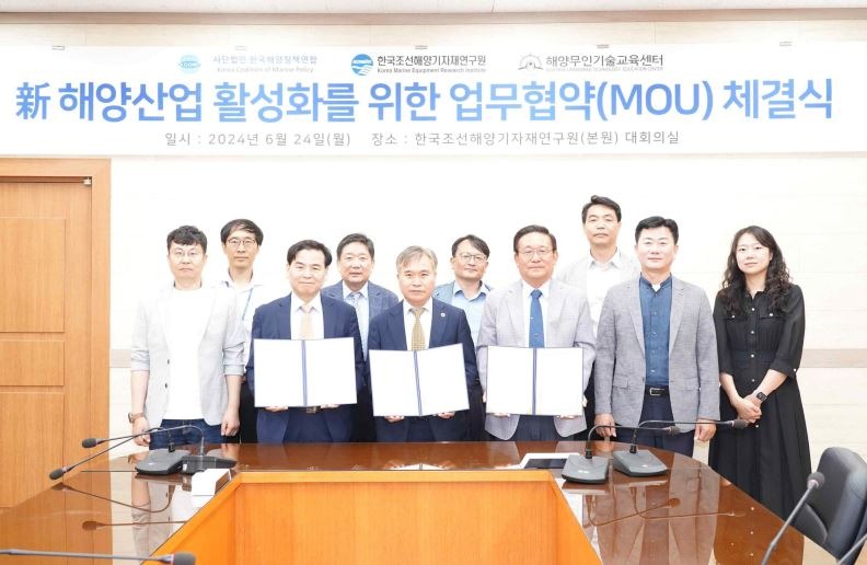 한국조선해양기자재연구원(원장 배정철, 이하 KOMERI)은 6월 24일(월) KOMERI 본원 대회의실에서 한국해양정책연합(이사장 도덕희), 국립한국해양대학교 해양무인기술교육센터(센터장 김용환)와 신 해양산업 활성화를 위한 업무협약을 체결했다.