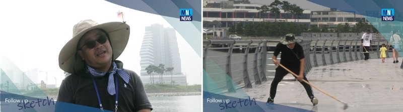 ▲ 김종원 거북섬축제 총감독(좌), 소나기 후 시민들의 안전을 위해 빗물 바닥 청소를 하는 직원모습(우)