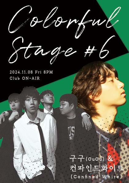 '컬러풀 스테이지 #6'가 오는 11월 8일 오후 8시 서울 마포구 클럽온에어에서 개최된다. 이번 콘서트에는 싱어송라이터 구구(GuGu)와 밴드 컨파인드 화이트가 출연해 다채로운 음악을 선사할 예정이다.