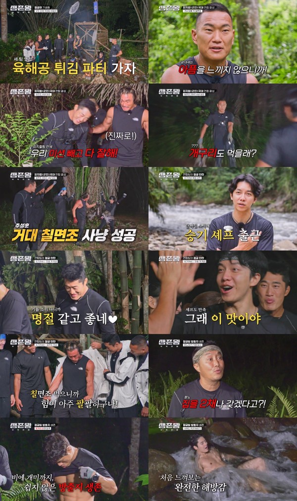 한편, ‘군인팀’ 이승기X강민호X아모띠는 김병만이 지어줘 쾌적하지만, 이제는 비어버린 국가대표팀의 생존지를 차지했다. 강이 흘러 뷰까지 완벽한 생존지에 이승기는 “이래서 옛날 사람들이 침략을 했나 보다”라며 만족했다.