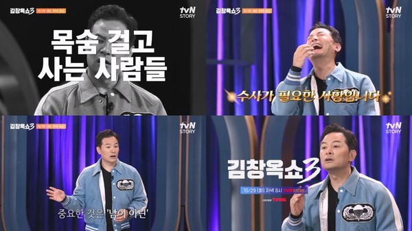 오늘 29일(화) 저녁 8시 tvN STORY에서 방송되는 ‘김창옥쇼3’(연출 김범석, 김효연) 7화는 ‘목숨 걸고 사는 사람들’을 주제로 다양한 관계와 상황에 목숨을 거는 사람들의 이야기가 방출된다.