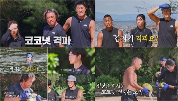 ‘코코넛 격파’는 바다 위에 있는 코코넛 25개와 섬 안 곳곳에 있는 코코넛 25개를 한자리에 모은 후, 코코넛을 격파해 코코넛 워터를 수조에 먼저 채운 팀이 이기는 미션이다.