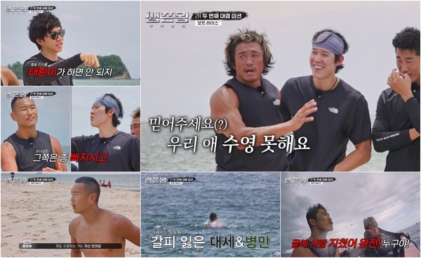 18일(오늘) 밤 10시 방송되는 '생존왕 : 부족전쟁'에서는 2R 두 번째 대결 ‘보트 레이스’가 시작된다. ‘보트 레이스’는 해변에서 150m 떨어진 바다 위에 있는 각 팀 보트에 팀원 3명이 탑승하고, 수영 대표 1명이 보트까지 수영해 간 뒤 2명이 함께 보트를 끌고 해변으로 돌아와 깃발을 먼저 뽑는 미션이다.