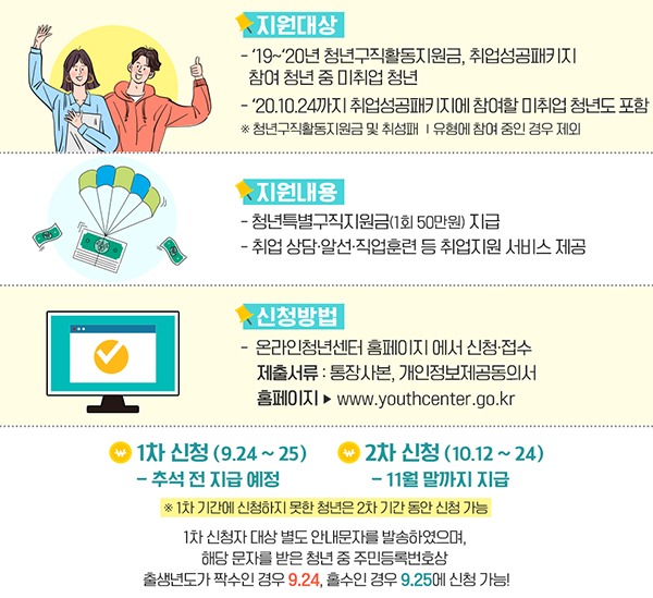 적극적 구직의사를 가진 저소득·미취업 청년을 대상으로 1인당 50만원을 지급하는 ‘청년특별구직지원금’ 2차 신청이 12일부터 시작된다.