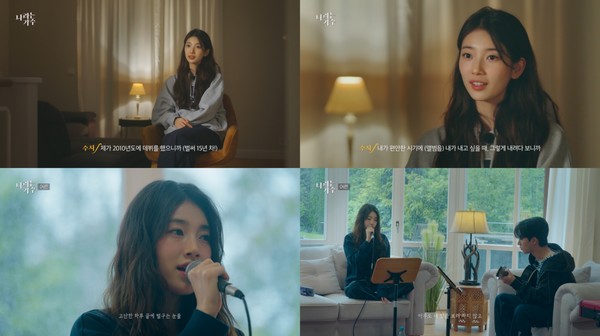 이날 공개된 영상에서 수지는 “제가 2010년도에 데뷔했다. 어느 순간부터 사람들한테 막 알린다는 느낌보다 내가 편안한 시기에 내고 싶을 때 내려다보니까 앨범을 내는 게 조금씩 더뎌지는 것 같다”라며 아티스트로서 자신의 음악적 이야기를 꺼냈다.
