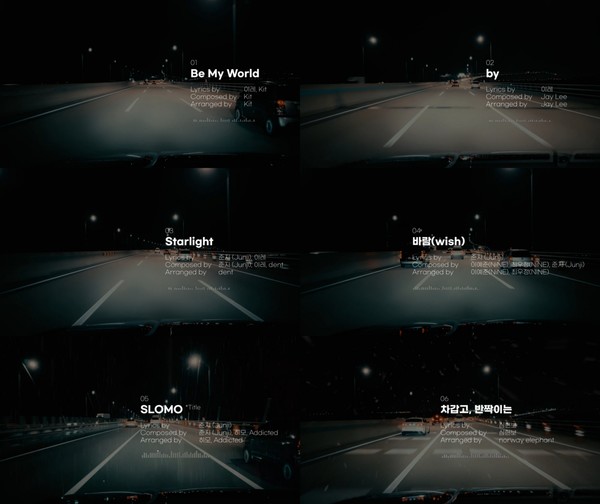 타이틀곡 ‘SLOMO(슬로모)’와 더불어 ‘Be My World(비 마이 월드)’, ‘by(바이)’, ‘Starlight(스타라이트)’, ‘바람(wish)’, ‘차갑고, 반짝이는’까지 총 6곡의 음원 일부가 추운 날씨를 잠시 잊게 하는 포근한 귀 호강을 선사했다.