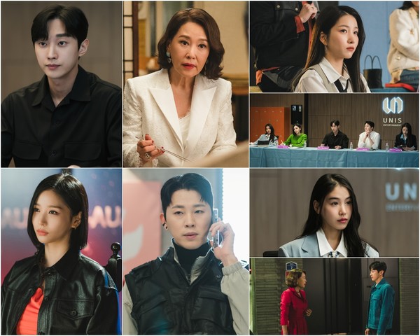 오늘(10일) 공개된 스틸에는 유니스 엔터테인먼트(이하 유니스 엔터)에 모인 진영(대니얼 한 역)과 차화연(김애심 역)을 비롯해 이화겸(임리나 역), 이달(정호이 역), 김소원(서찬미 역), 오지연(권준희 역)의 모습이 공개돼 이목을 집중시킨다.