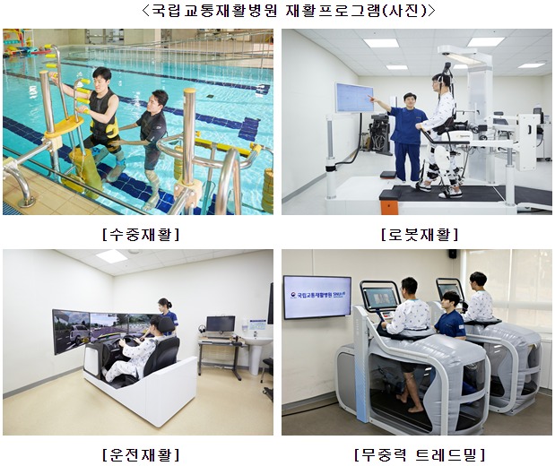 한편, 국립교통재활병원은 질환별 재활센터(뇌․척수․근골격계․소아 등 4개) 및 수중․로봇(상․하반신, 웨어러블 등)․운전재활, 무중력 트레드밀 등 일반 재활병원에서 접하기 어려운 우수한 재활치료 프로그램들을 제공하고 있다.