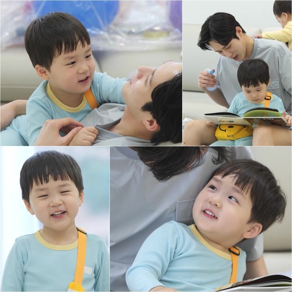 은우는 난데없이 머리 위로 흩뿌려지는 물에 동화책이 젖어가자, 화를 내기는커녕 아무 일도 없다는 듯 동화책 읽기에 몰두한다고. 이에 김준호는 “아빠가 재채기해서 그런가?”라며 능청스러운 태도로 더욱 물을 뿌리며 ‘장난꾸러기’ 면모를 더한다.