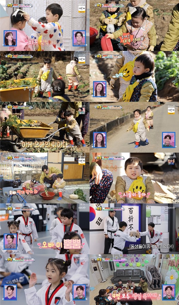 “지우는 진짜 사랑이야. 말을 어쩜 저리 예쁘게 잘해”, “은우는 무를 딸기 따듯이 쉽게 따네. 무 한 손으로 드는 장면은 최고의 등장 씬이다”, “인성이 3장 멋지게 격파하고 동생들 앞에서 뿌듯해하는 거 기특”, “재운, 인성, 아영, 승우 넷이서 옹기종기 모여서 한글 공부하는 게 넘 예쁨” 등 애정 가득한 반응이 이어졌다.