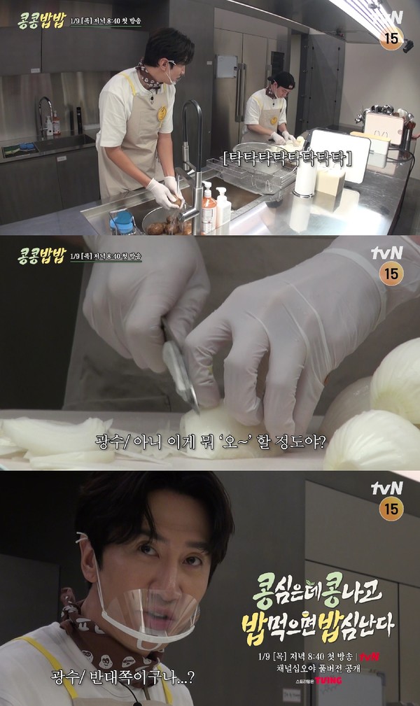 공개된 1회 예고 영상에는 두 사람이 위생 마스크와 앞치마를 착용한 채 진지하게 요리에 집중하는 모습이 담겨 있다. 특히 빠른 속도로 양파를 써는 도경수의 칼질을 보고 스태프들이 감탄하자 이광수가 “이게 오 할 정도야?”라며 귀여운 질투심을 폭발시킨다.