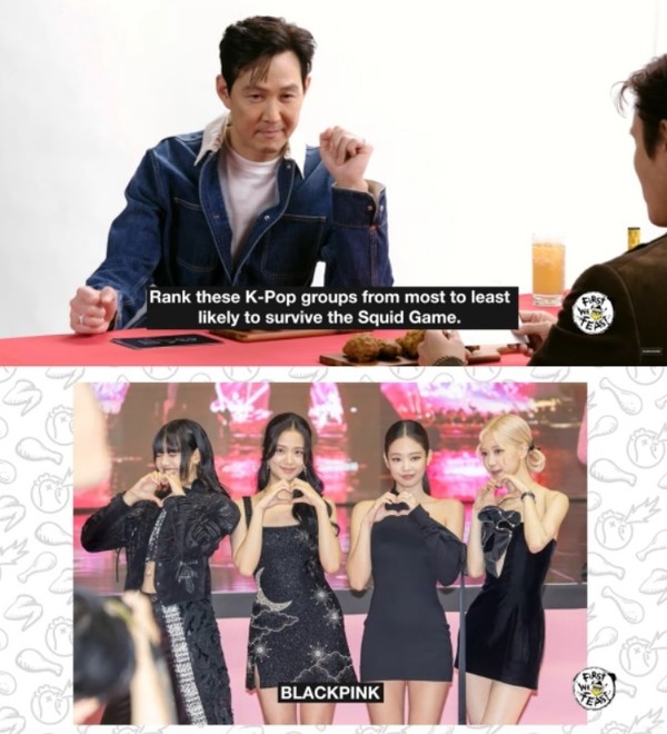 이날 이병헌은 “K팝 그룹 중 ‘오징어 게임’에서 살아남을 가능성이 높은 순위로 방탄소년단, 블랙핑크, 트와이스를 매겨달라”고 질문했다. 이에 이정재는 쑥스러운 웃음을 지으며 “제가 좋아하는 순서대로 블랙핑크, 방탄소년단, 트와이스”라고 답했다. 이를 들은 이병헌은 “트와이스가 슬퍼하겠다”고 농담하며 현장을 웃음바다로 만들었다.