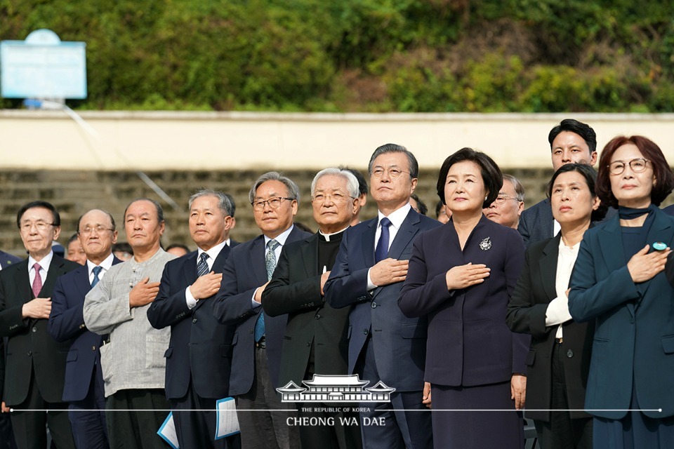 이후 부마민주항쟁 관련자와 시민단체 활동가가 함께 애국가를 제창하며 송기인 부마민주항쟁기념재단 이사장이 부마민주항쟁에 참가했던 故 신용길 씨의 시를 읊으며 묵념을 한다.