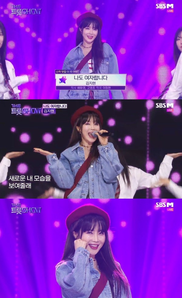 김지현은 지난 3일 방송된 SBS M ‘더트롯쇼’에 출연해 새 싱글 ‘나도 여자랍니다’ 무대를 선보였다.