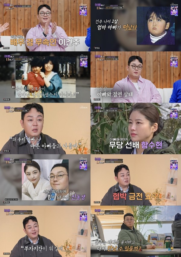 11일 방송된 TV CHOSUN '아빠하고 나하고'에서는 '배우 겸 무속인' 이건주가 출연해 10년째 아빠를 안 보고 살고 있는 안타까운 가족사를 공개했다. 또 신내림을 받고 무속인의 길을 걷고 있는 두 번째 인생에 대해 털어놓으며 시청자들의 마음을 울렸다.