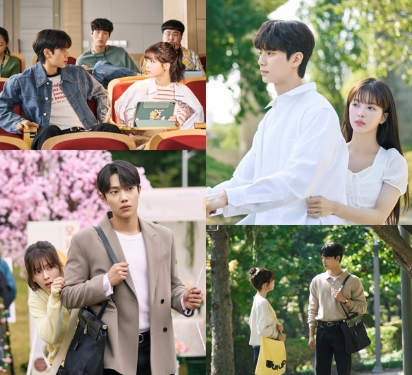 특히 공개된 사진 속에는 서로에 대한 설렘을 싹틔우고 있는 청춘들의 모습이 담겨 눈길을 끈다. 벚꽃이 만개한 캠퍼스를 배경으로 바니와 황재열, 그리고 차지원이 눈부신 비주얼 케미스트리를 뽐내고 있는 것.