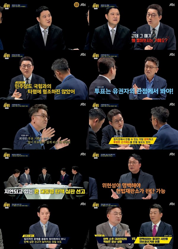 이어지는 ‘특집 썰전’의 스페셜 코너 ‘여야의 밤’에서는 각 정당의 법조인 출신 의원들이 출연해 윤 대통령 탄핵 심판 선고 지연을 두고 소속 정당의 분위기를 전했다.