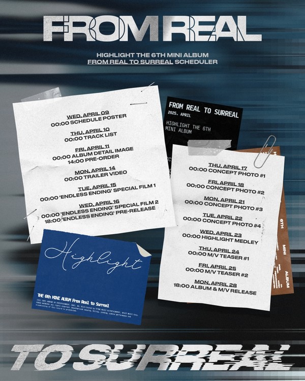 이를 전후로 하이라이트는 미니 6집의 트랙리스트, 트레일러 비디오, 콘셉트 포토 4종, 하이라이트 메들리, 뮤직비디오 티저 2종 등 티저를 순차 공개한다. 11일 오후 2시부터는 ‘From Real to Surreal’ 피지컬 앨범에 대한 예약 판매를 시작하며 컴백 열기를 높여갈 예정이다.