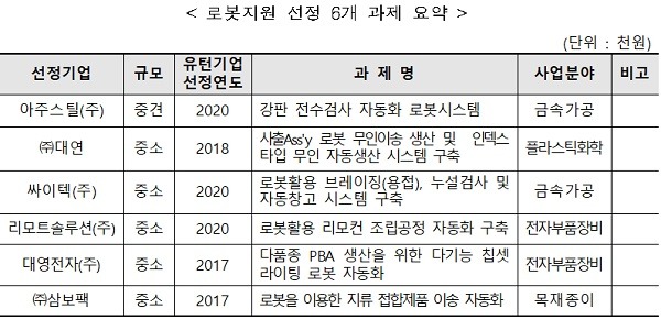 아주스틸, 대연, 싸이텍, 리모트솔루션, 대영전자, 삼보팩 등 총 6개 유턴기업이 로봇활용 제조혁신지원사업 지원 대상으로 선정됐다.