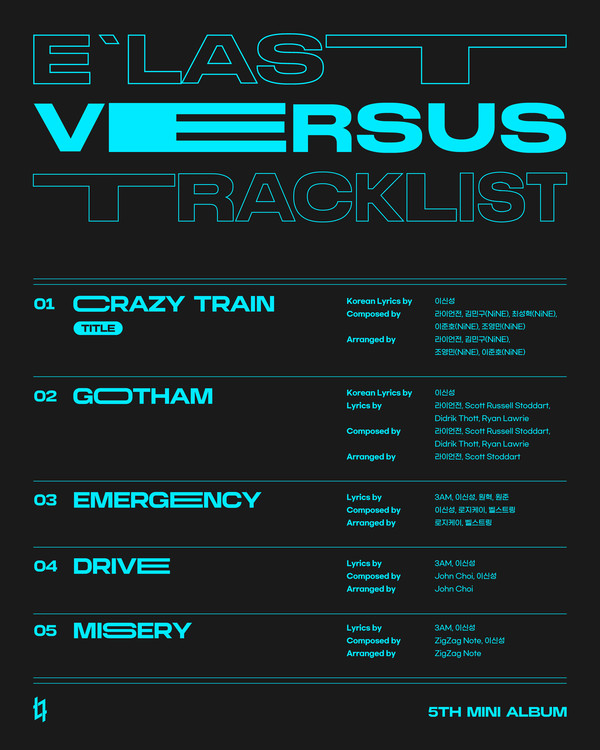 15일 공개된 트랙리스트에는 미니 5집의 타이틀곡 ‘CRAZY TRAIN’(크레이지 트래인)을 포함해 ‘GOTHAM’(고담), ‘EMERGENCY’(이멀전시), ‘DRIVE’(드라이브), ‘MISERY’(미저리) 총 5곡의 제목이 적혀있다.