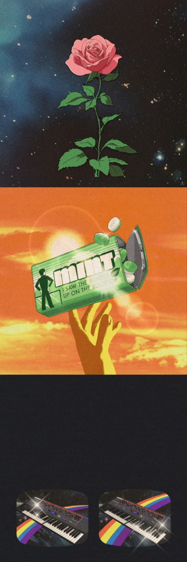 '뮤직', 'FLASH', '아윌다이포유X3', '옥상에서 혼자 노을을 봤음', 'Juno! 무지개 좌표를 알려줘!', '모든 소년 소녀들1: 버드맨', '모든 소년 소녀들2: 무지개'까지 총 7개 트랙의 아트워크에는 레트로하고 키치한 감성의 상징들이 녹아 있어 재미를 전한다.