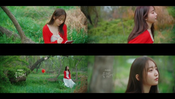 영상 속 펀치는 몽환적인 느낌이 드는 숲속에 홀로 앉아있다. 펀치는 청순한 외모를 더욱 돋보이게 하는 하늘하늘한 드레스에 강렬한 레드 아이템을 매치해 매혹적인 분위기를 더했다.