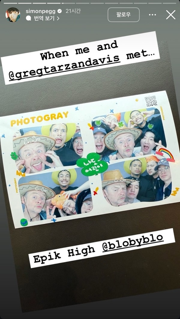 배우 사이먼 페그(Simon Pegg)는 지난 8일 본인의 SNS 계정을 통해 에픽하이(타블로, 미쓰라, 투컷)와 함께한 스토리 게시물을 게재했다.