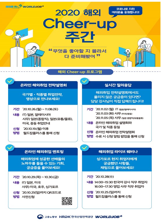 고용노동부가 주최하고 한국산업인력공단(이하 공단)이 주관하는 ‘2020 해외 Cheer-up 주간’이 26일부터 11월 8일까지 14일간 월드잡플러스(www.worldjob.or.kr)를 통해 온라인으로 개최된다.