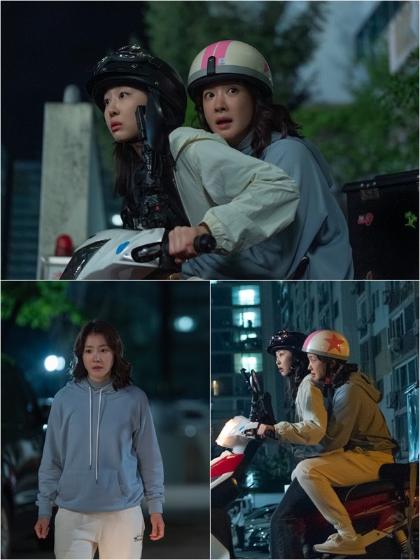 공개된 사진 속 공미리는 어둠이 짙게 내려앉은 아파트 단지 내에서 심상치 않은 무언가를 목격한 듯 당혹스러운 표정을 하고 있어 긴장감을 자아낸다. 이어 아파트 빌런을 잡기 위해 숨가쁜 추격전을 벌이고 있는 공미리와 박소희의 걸크러시 매력이 단번에 시선을 사로잡는다.
