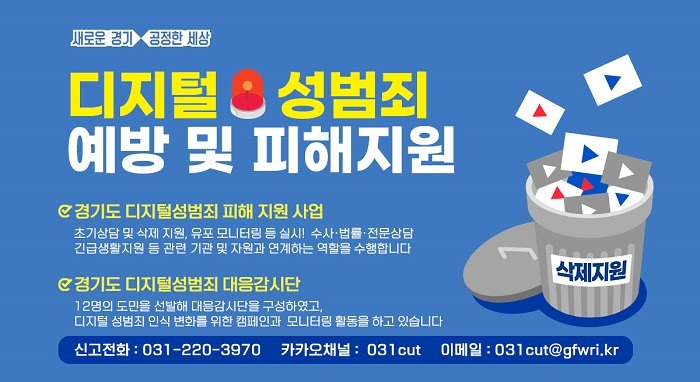 이밖에도 도는 지난 9월부터 각종 영상미디어를 통해 디지털성범죄 피해자에 대한 지원책을 홍보하는 한편 디지털성범죄 근절 사이버 교육 콘텐츠를 제작해 11월부터 경기도 공직자와 공공기관 임직원을 대상으로 디지털성범죄 예방 및 근절 교육도 실시할 계획이다.