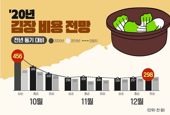 김장을 10월 상순에 했을 경우 4인 가구 기준으로 45만 6000원이 들지만 점차 하락해 12월 하순에는 29만 8000원이 되는 것으로 분석됐다.