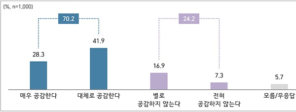 한편 지방자치법 전부개정안의 조속한 통과 주장에 대해 70.2%가 공감하는 것으로 나타났는데, 현재 국회에 상정되어 있는 지방자치법 전부개정안은 30여년 만에 추진되는 것으로 지방자치제가 한 단계 도약할 수 있다는 점에서 그 의미가 크다.
