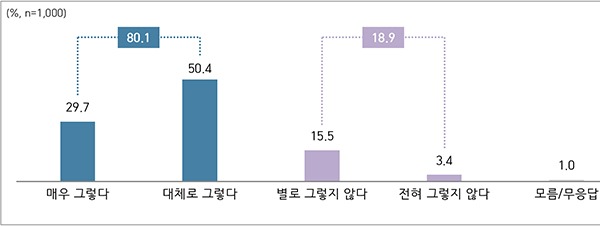 특히 지방자치단체가 코로나19 방역에 기여했다고 평가하는 응답은 80.1%로 다수의 국민들이 이번 코로나19대응 과정에서 지방자치단체 역할의 중요성에 대해 실감했으며, 자치분권의 강화를 통해 주민의 안전을 위한 지방자치단체의 선제적 행정추진에 공감한다는 것으로 판단된다.