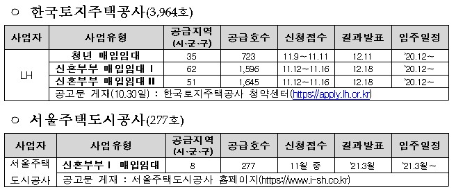 청년임대는 신청접수 11월 9~11일, 결과발표 12월 11일이고 신혼부부는 신청접수 11월 12~16일, 결과는 12월 18일 발표한다.