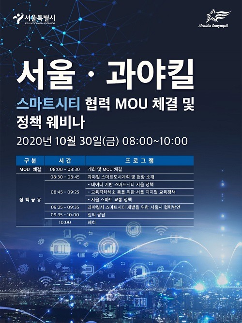 서정협 서울시장 권한대행은 “서울시는 7회 연속 전자정부 세계 1위의 글로벌 리딩도시로서 최첨단 ICT 인프라와 빅데이터, 인공지능, IoT 같은 핵심기술, 도시 행정을 접목해 지속가능성과 포용성을 모두 갖춘 ‘사람중심’의 스마트 시티로 거듭나고 있다. 나아가 세계 도시와 그 노하우를 나누는데도 앞장서고 있다”며 “에콰도르 과야킬시와의 업무협약을 시작으로 데이터를 기반으로 한 서울형 스마트시티 모델, 스마트기술을 기반으로 한 코로나시대 교육격차 해소 정책 등 서울의 다양한 스마트시티 공공서비스를 공유하겠다. 한국 우수기업들의 에콰도르 진출도 한층 활발해질 것으로 기대한다”고 말했다.