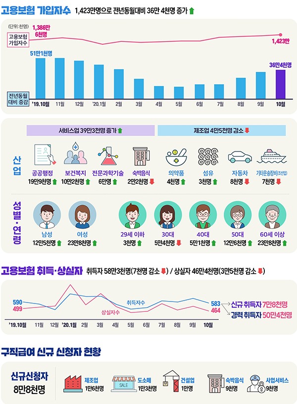 올해 10월 고용보험 가입자 수는 1423만 명으로 전년동월대비 36만 4000명이 증가한 것으로 나타났다. 5개월 연속 증가이며 월별 증가 폭은 올해 2월(37만6000명) 수준을 거의 회복한 것이다.
