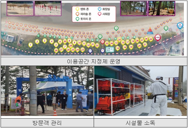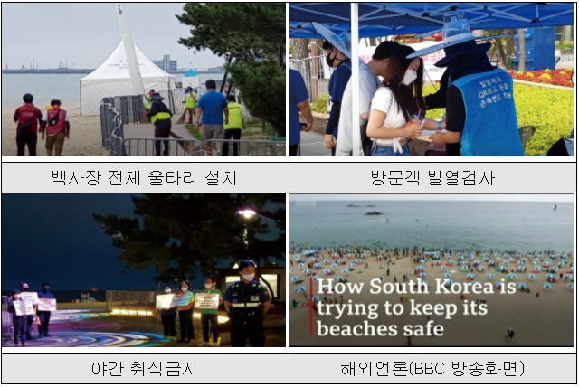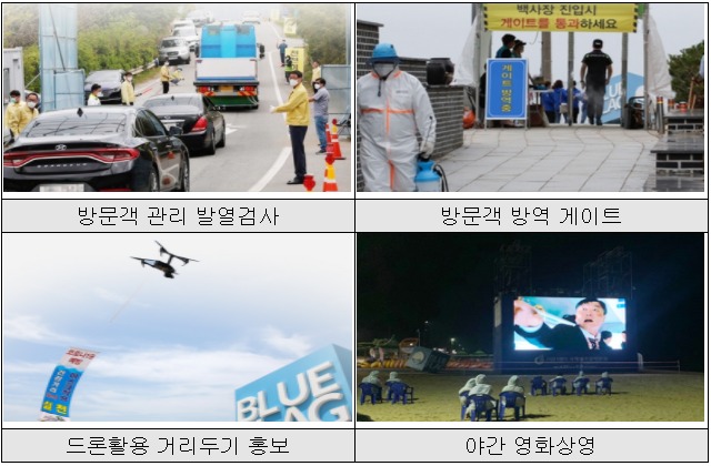또한, 해수욕장 일부를 사전예약제로 운영하고 지정한 백사장에서만 휴식을 취할 수 있게 했으며, 드론을 활용한 거리두기 홍보와 안내방송을 지속적으로 실시하여 해수욕장 내 거리두기 참여를 유도하였다.