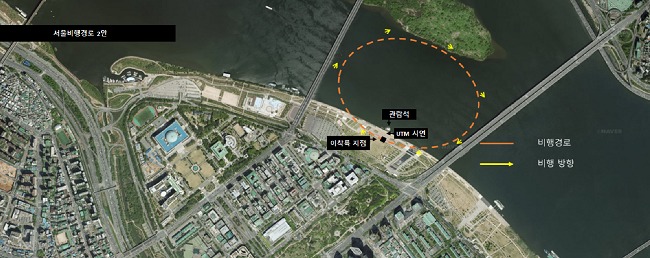 실증에는 2인승급 드론기체 1대가 투입되며, 해발 50m 상공에서 여의도 한강공원, 서강대교, 밤섬, 마포대교 일대 1.8km를 두 바퀴(총 3.6km) 약 7분간 비행한다. 서울의 중심이자, 우리나라 최초의 비행장이 있던 여의도에서 비행한다는 점에서 의미가 더 크다.