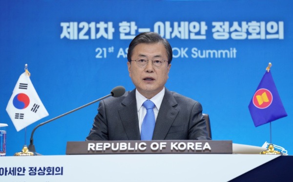 문 대통령은 이날 화상으로 개최된 제21차 한·아세안 정상회의에서 “예기치 못한 도전을 겪을 때마다 ‘연합과 대응’으로 위기를 극복하고, 더 나은 미래를 만들어 가는 아세안 정상들의 혜안과 지도력에 경의를 표하며, 한국도 아세안과 함께 서로 도움을 나누고자 한다”며 이같이 말했다.