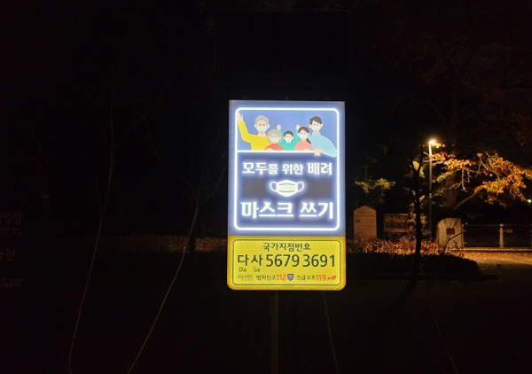 서울대공원에서 설치한 국가지점번호판은 야간에도 식별이 가능하도록 조명 대신 태양열을 이용해 효율적으로 번호판이 잘 보이도록 했다. 더불어 이번 설치한 국가지점번호판에는 코로나19 일상화에 따른 생활 속 마스크쓰기 독려 문구도 함께 넣어 시민들이 야외공원 이용시에도 보건수칙을 잘 지키도록 했다.