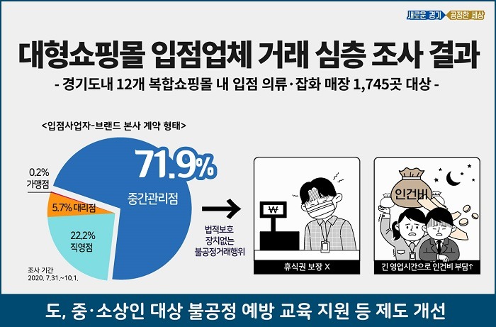 도는 먼저 도내 12개 복합쇼핑몰 내 입점 의류·잡화매장 1,745곳을 대상으로 ‘입점사업자와 브랜드 본사 계약 형태’를 조사했다. 그 결과 중간관리점이 71.9%로 가장 많았고 직영점 22.2%, 대리점 5.7%, 가맹점 0.2% 순이었다.