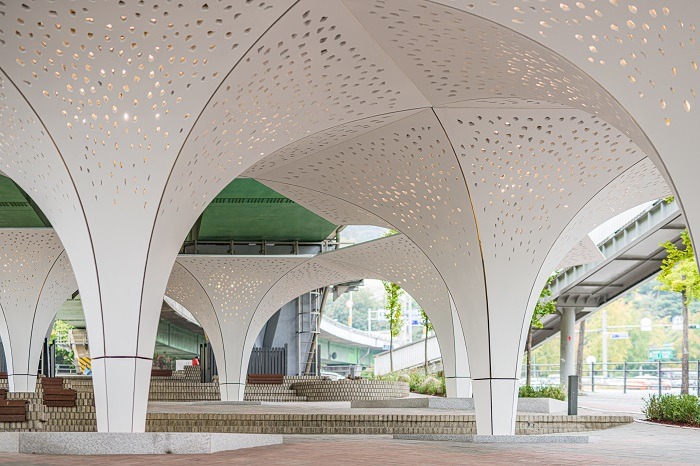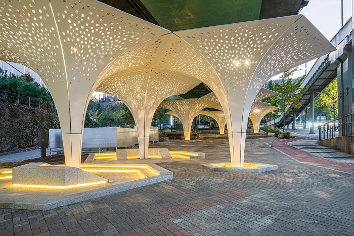 어둡고 차가운 응달이었던 계단식 공터에 새하얀 나팔꽃 모양의 차양 구조물(지름 6m, 높이 4m) 9개를 마치 꽃밭처럼 배치했다. 꽃잎은 유리섬유강화콘크리트(GFRC)로 만들어 섬세한 모습을 잘 구현해냈다. 차양 내부에는 발광다이오드(LED) 조명을 설치해 밤에도 보행자의 시야를 환하게 밝히고 LED 빛이 만들어내는 장관이 고가 하부 도시경관을 풍요롭게 만들도록 했다.