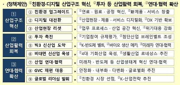 이에 따라 정부는 철강·석유화학 등 주력산업은 혁신적 기술개발을 통해 환경친화형으로 전환하고 바이오·미래차 등 저탄소 신산업을 적극 육성하며 주력산업에 데이터·5G·AI 등 디지털 기술을 접목, 신제품·서비스를 개발하고 산업현장의 생산성 향상을 지원해 산업구조를 혁신하겠다고 밝혔다.