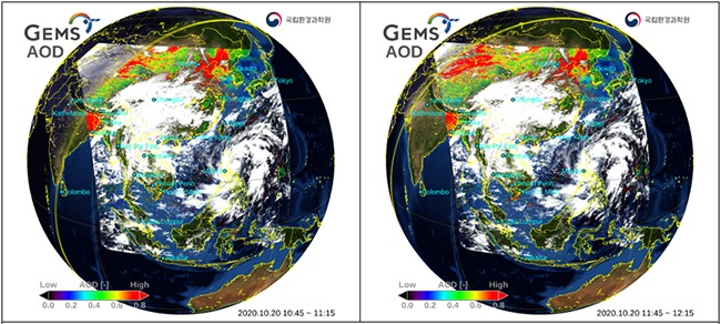 영상 자료를 통해 미세먼지 농도와 관련된 에어로졸 광학두께(AOD), 이산화질소(NO2), 아황산가스(SO2)와 오존(O3)의 시간대별 발생, 이동 및 분포 현황을 확인할 수 있다.