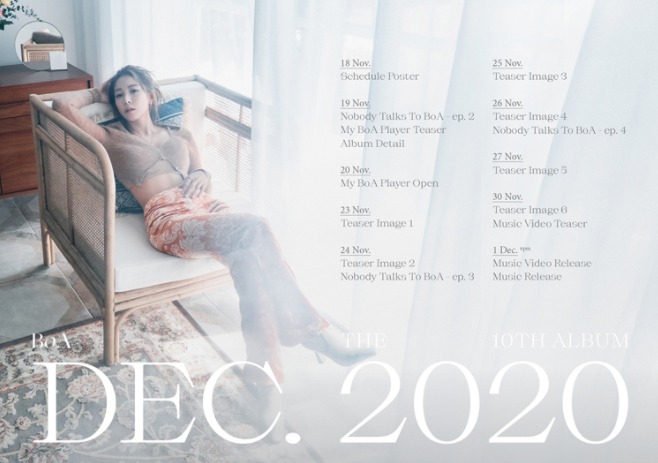 지난 18일 보아 공식 SNS 계정을 통해 공개된 스케줄 포스터에는 몽환적인 분위기의 보아 이미지와 다채로운 콘텐츠 일정이 담겨 있어 컴백 기대감을 증폭시켰다.