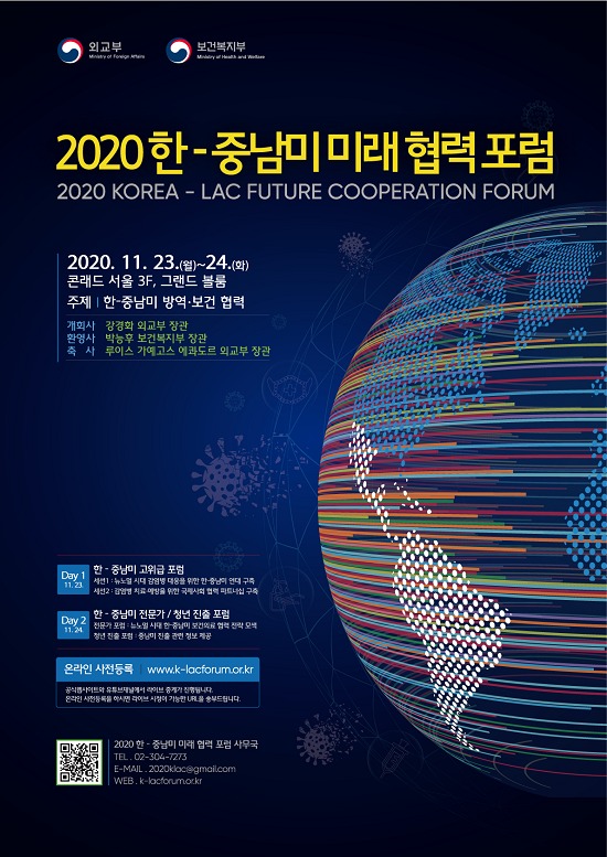 외교부와 보건복지부는 11.23.(월)-24.(화) 이틀간 서울 여의도 콘래드 호텔에서 코로나19 확산 이후 해외 장차관급 고위 인사들이 직접 방한하여 개최되는 최초의 다자 행사인‘2020 한-중남미 미래협력포럼’을 공동으로 개최할 예정이다.