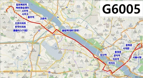 G6005번은 원도심인 감정동 홈플러스에서 출발해 한국아파트, 산호아파트를 지나 걸포북변역∼사우역∼풍무역∼고촌역에서 올림픽대로로 당산역, 여의도, 서울시청까지 운행하는 노선으로 당분간 8대가 운행될 예정이며, 코로나19 해소 시 10대로 증차 되면 배차간격은 현재 30∼60분(8600번)에서 15∼25분으로 줄어들 예정이다.