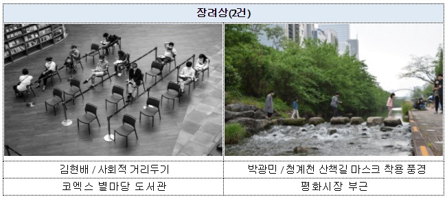 최우수작으로 선정된 신준희 씨의 「일상이 된 거리두기」는 비 내리는 궂은 날씨 속에서도 시민들이 일정한 간격을 둔 채 횡단보도 신호를 기다리는 모습을 담은 작품으로, 서울시의 코로나 방역정책에 적극 협조하는 시민의 자발적인 참여와 일상 풍경이 잘 나타나 있다.