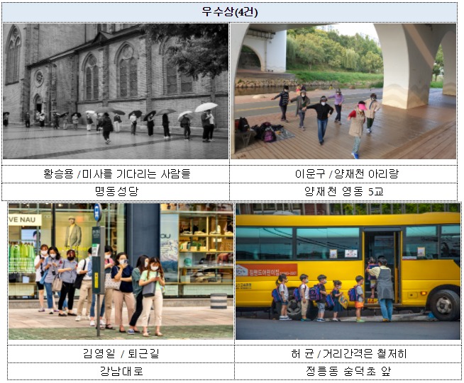 이외에도 거리두기를 지키며 명동성당의 미사를 기다리는 시민들의 모습, 거리 간격을 철저히 지키며 등원버스를 타는 아이들의 모습 등을 담은 작품이 수상작으로 선정되어 코로나19로 사소한 일상 풍경의 많은 부분이 달라졌음을 실감케 했다.